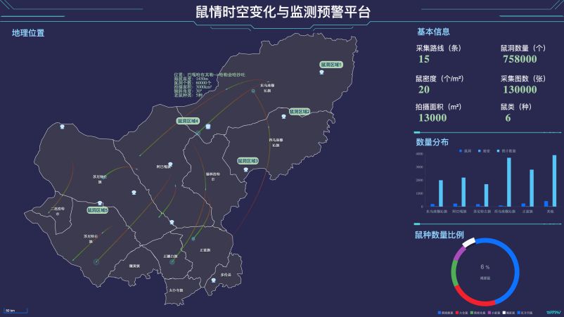 针对草原面积广阔,鼠害信息难以准确获取,严重依赖人工手段,制约调查和防治效率低等问题,构建了系列智能化调查装备与数据管理与分析网站组成的平台。智能化装备由针对鼠洞鼠迹识别的智能手持终端、鼠类活动频率监测仪、猛禽天敌智慧监测仪、草原植被360°监测站等4款硬件装备构成,数据上传后形成“鼠情展示一张图”,实现对草原鼠害防治的影像采集、鼠迹图像获取、信息解析、管理决策的智慧防治一体化的管理平台。
