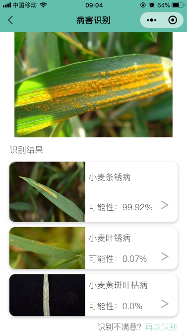 • 农作物病害识别APP 依托微信小程序,可及时识别小麦、水稻、油菜、玉米、苹果、棉花和柑橘七类作物的100多种病害。 更多>