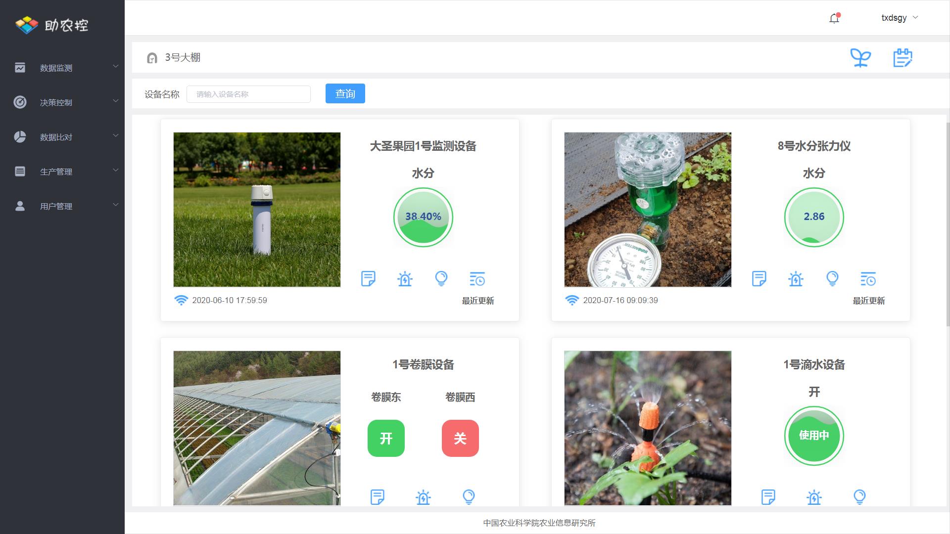 • 设施蔬菜生产智能管控装备 设施农业生产智能管控软硬件设施,对农作物生长全流程进行控温、控水、控肥等科学高效、智能化的操作管理,为实现设施农业跨地区、规模化种植管理提供一体化解决方案。 更多>