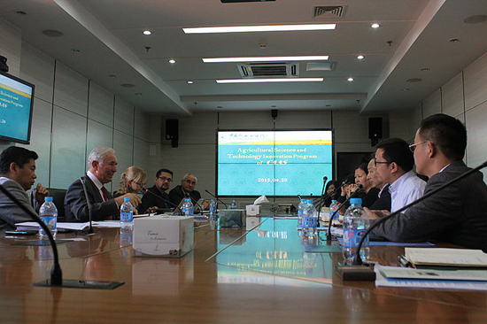 4月22日,澳大利亚默多克大学第二届国际事务委员会粮食安全代表团约翰•爱德华(John Edwards)教授等一行4人来信息所访问交流。农业部国际合作司张陆彪副司长、中国农业科学院创新工程办公室方放主任、国际玉米小麦改良中心(CIMMTY)中国办事处何中虎主任、信息所孟宪学副所长和科技处