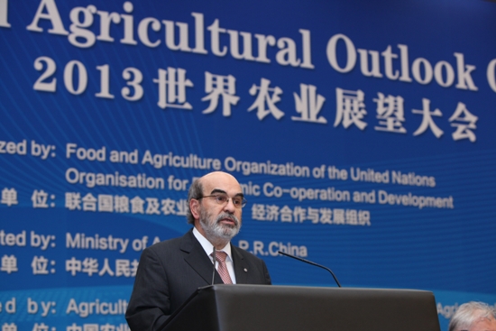 FAO总干事何塞•格拉齐亚诺•达席尔瓦(Jose Graziano da Silva)在致辞中指出,当前全球农产品市场价格波动频率、幅度明显增强,开展农业展望显得十分重要和迫切。FAO高度重视中国在全球农产品市场上的作用和地位,近年来,在TCP项目的支持下,FAO与中国在农业基础数据、分析方法等方面联系更加紧密,并搭建了基本的合作框架。2013年世界农业展望大会为各国同行开展全球农业发展所面临的热点问题,特别是现阶段中国农业发展所面临的挑战提供了一个很好的平台。