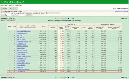 6月18日,汤森路透旗下的知识产权与科技事业部发布了2014年期刊引证报告(Journal Citation Reports,JCR)。《农业科学学报》(Journal of Integrative Agriculture,JIA)影响因子为0.833,在56种农业综合类期刊中排名第20位,进入了排位前50%的期刊(Q2)。影响因子较去年提高33%,排名提前了10位。