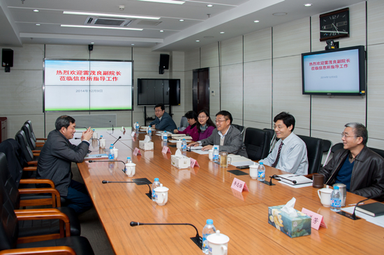 调研中,雷茂良副院长先后参观了院网络中心机房、图书馆机房、古籍书库、阅览大厅、农业监测预警研究空间、信息分析研究区和信息技术研究区。在座谈交流中,