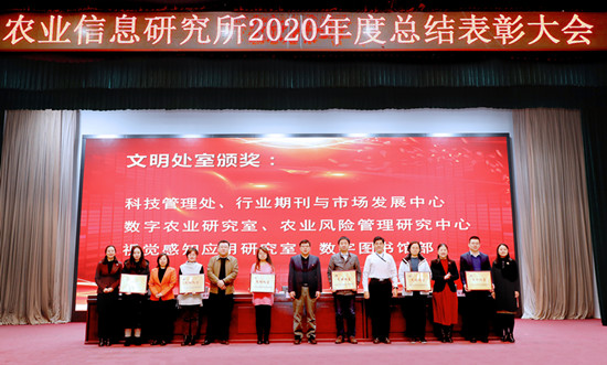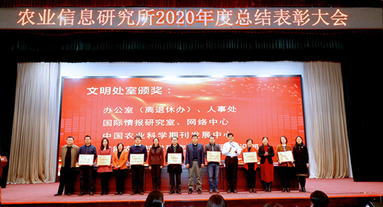 聂凤英发布了2020年信息所科技产出奖励名单,包括国家级课题奖励、获奖成果、咨询报告批示、高水平学术论文以及业务绩效考核前十名。赵瑞雪发布了2020年信息所非科技奖励名单,包括文明处室、所级文明职工、年度考核优秀者、所优秀党员、所考核优秀党支部、其他获奖集体和个人等。所领导及所长助理为文明处室颁发了奖牌。