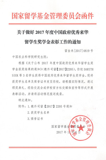 近日从研究生院获悉,我所柬埔寨籍博士留学生DARITH SIEK (导师为许世卫研究员)喜获2017年度中国政府优秀来华留学生奖学金。