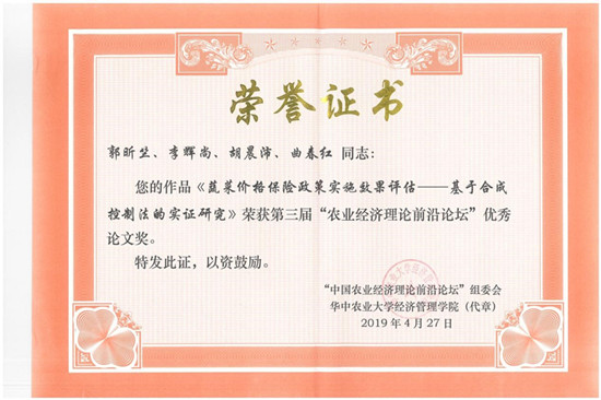 本次论坛得到全国农业经济等学术界的广泛支持和关注,投稿论文多达180多篇,经过组委会三轮匿名评审和汇报、讨论后,共评出十篇优秀论文并予颁奖。由我所“海外农业与国际情报创新团队”骨干李辉尚副研究员指导、硕士研究生郭昕竺同学等为共同作者的《蔬菜价格保险政策实施效果评估——基于合成控制法的实证研究》,获得本次会议的优秀论文奖。郭昕竺同学代表研究团队进行了专题汇报,黄季焜教授、赵敏娟教授、司伟教授等专家对论文选题、数据尺度和研究方法等方面做了细致、专业点评,并给出了具体修改意见和建议。