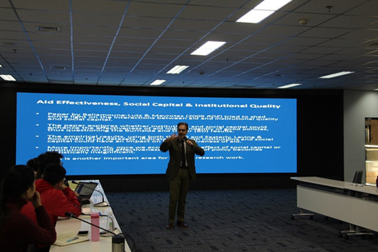 讲座上,George Mavrotas博士系统回顾了全球化背景下对外援助发展情况,并围绕从“对外援助是否显著促进受援国经济发展与减少贫困”、“援助能否为受援国带来变革及相关机构在此过程中起的作用”、“对外援助如何影响受援国政府决策和外援不均衡性问题”、“影响对外援助效果的因素”,及“对外援助实践经验教训”等五个方面,进行了深入细致地阐述。在谈到对外援助的两面性时,George Mavrotas博士认为对外援助通过诱致正效应政策、设立高效机构、减少相关基金对投资领域壁垒和有效利用金融杠杆等四个方面来促进受援国经济发展和减少贫困。会上提问环节互动频繁,师生纷纷就自身在外援研究中的难点和疑点困惑向与会专家提问。