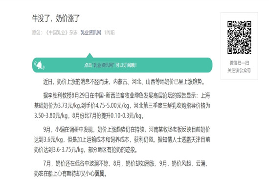 2018年9月16日,《中国乳业》杂志社的微信公众号“乳业资讯网”刊登了一则题为“牛没了,奶价涨了”的原创评论文章。该文针对乳业行业的当前热点问题,描述了8月以来全国部分地区奶价上涨的趋势,并就推动奶价上涨的因素进行了综合分析,比如粪尿消纳给牧场的环保压力、全国奶牛存栏数量减少造成的奶源短缺、关税提升引发的养殖成本增多、石油价格提升致使生产消耗品的采购成本提高、夏季奶牛热应激、中秋和十一“双节”来临消费需求增加等。该文由《中国乳业》编辑夏千童执笔,王玉庭指导完成。