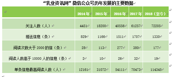 “乳业资讯网”微信公众号于2014年3月24日正式运行,对行业活动、会议和新闻进行每日推送。四年多来,共发布文章6543篇,最高阅读数超10万+,2018年头条篇均阅读量约为4400,在行业内影响力逐渐扩大,已经成为乳业中关注人数最多、影响力最大的微信公众号。