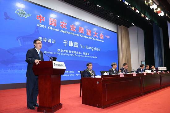 于康震在讲话中指出,2021年是“十四五”开局之年,是开启全面建设社会主义现代化国家新征程的第一年,也是向第二个百年奋斗目标迈进的关键时间节点。农业农村部已明确将“保供固安全,振兴畅循环”作为“十四五”农业农村工作核心,坚持把保总量放在保供的首位。多措并举、同向发力,提高供给体系的适配性,增强供应链稳定性可靠性和韧性,实现高质量保供。他表示,我国粮食产量连续6年保持在1.3万亿斤以上,农民收入持续快速增长,消除了绝对贫困和区域性整体贫困,农村面貌焕然一新。2020年以来,全国上下积极应对新冠肺炎疫情冲击,紧盯关键农时,狠抓措施落实,农业发展取得可喜的成绩。2020年,人均粮食占有量达到470公斤,远高于国际粮食安全标准线;生猪存栏已恢复到2017年的92%,今年下半年生猪存栏即可以恢复到正常年份的水平,猪肉供应最紧张的时期已经过去。2021年春耕生产正由南到北梯次展开,根据农情调度,全国冬小麦种植面积比上年增加300多万亩;冬油菜种植面积比上年增加400多万亩,尤其是苗情和墒情非常好;受益于价格上涨、种植收益改善,玉米种植面积有望明显恢复。非洲猪瘟疫情总体平稳,生猪生产保持持续恢复的势头,猪肉价格也出现明显回落。当前国内外农产品市场运行的不确定性增大,展望大会通过粮食等重要农产品供需形势会商和发布,来引导市场预期、服务生产经营,契合形势需要和各方诉求。他要求,要进一步完善农产品市场监测分析和预警体系,加快新技术应用,切实发挥好信息在稳预期、固安全方面的重要作用。农业农村部将继续加强指导支持,把展望大会打造成全球农业信息交流合作的标杆。