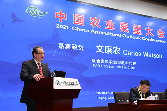 联合国粮农组织驻华代表文康农(Carlos Watson)在致辞中表示,中国农业展望大会见证了粮农组织和中国在过去十年中丰硕的合作,为中长期的农业市场趋势提供非常宝贵的信息。新冠疫情使当前的粮食与经济状况雪上加霜,让更多的人陷入贫困和饥饿。中国的农产品监测分析已经成为粮农组织全球预警信息系统重要力量,中国农业展望报告释放的权威市场信息和前沿分析,不仅仅有益于中国,而且也能够为全球市场提供宝贵参考。粮农组织一如既往的加强与各方面的密切合作,共同通过更好的市场信息分析,推动粮食和营养安全。