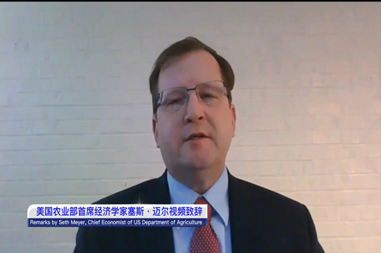 美国农业部首席经济学家塞斯·迈尔(Seth Meyer)作视频致辞。他在致辞中表示,美国和中国参加彼此主办的农业展望大会是两国双边合作的象征,也是两国掌握农业和粮食发展趋势的重要活动。受新冠疫情影响,全球增长前景继续面临不确定性,各国政府需要继续努力,畅通农产品市场流通和可获得性。同时要加强农业监测预警工作,更好地应对挑战。
