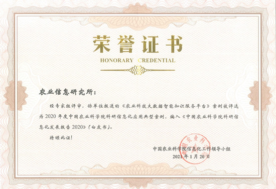 近日,中国农业科学院发布《中国农业科学院信息化发展报告2020(白皮书)》,对院属单位信息化发展水平进行了综合评估,信息所农业科技大数据智能知识服务平台入选十大科研信息化应用典型案例。