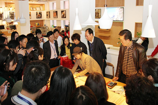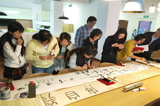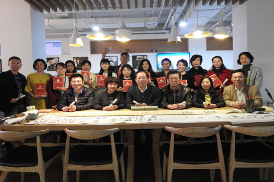 纸是中国古代四大发明之一,汉纸是指用于中国传统书画制作的具有相同传统工艺生产的相同特质的纸,它包括宣纸、元书纸、毛边纸、麻纸、藤纸等十多个品种。与会专家首先以实物展示了汉纸以及用汉纸印刷的工艺品、手册、典籍等,讲解了汉纸的历史、工艺、文化底蕴。听着专家的讲解,大家深深感受到了传统文化的魅力,为祖国古代璀璨的文明而自豪!在场全体人员还纷纷用毛笔在汉纸空白卷轴上题词或签名,体验笔墨与汉纸接触的奇妙感受。