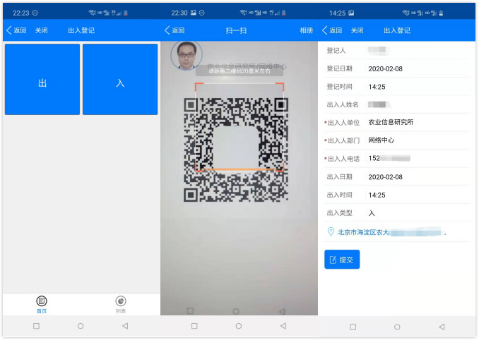 院领导和所领导班子对疫情防疫期间智慧农科和智慧院区对居家办公信息化支撑工作给予高度关注,针对他们提出的院区人员出入管控的需求,孙志国、于涛、刘洋、王晓丽紧急成立设计开发小组,利用两天时间开发了扫描智慧农科二维码进行快速人员登记认证的程序,供院区大门门卫使用,并于2月9日上午在孙坦副院长等院所(中心)各级领导的现场指导下在中关村院区进行了测试,该方式有别于传统的证件通行方式,可实现出入人员记录的可追溯,后续可根据该方式构建全院访客系统。