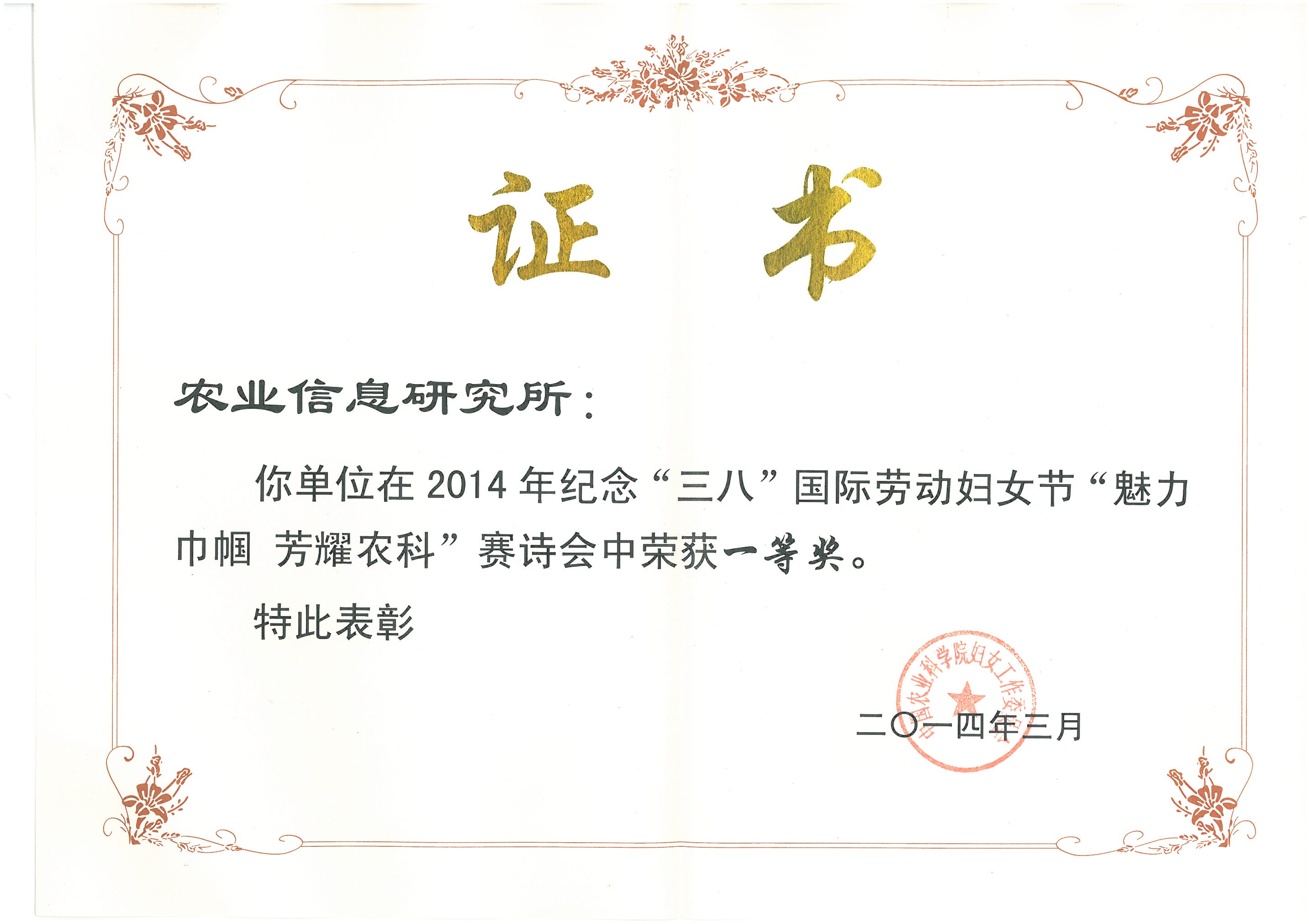 热烈祝贺信息所在院“魅力巾帼 芳耀农科”赛诗会中荣获一等奖