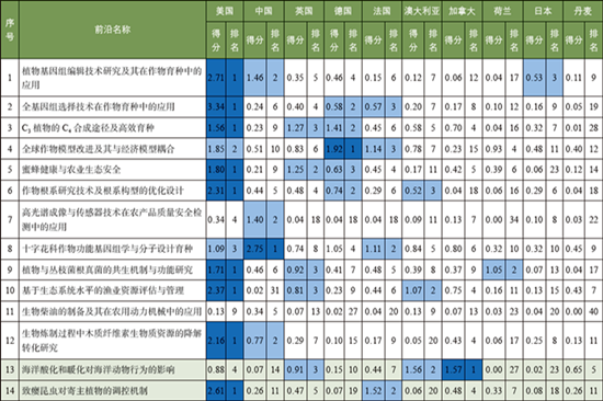 10个主要国家研究前沿表现力指数分前沿分析(得分+排名)