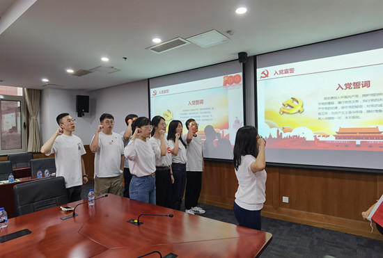随后,支部书记程思梦同志带领今年新吸收的7名预备党员,面向党旗,高举右拳,进行入党宣誓。誓言铿锵,承诺掷地,预备党员们以嘹亮、庄严的声音宣读入党誓词,向党组织表达了自己志不改、道不变的信念与决心,更筑牢了在场全体同志的初心根基。