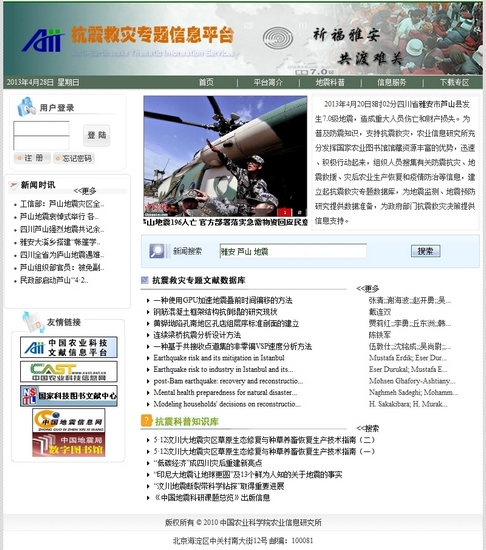 信息所服务人员充分发挥国家农业图书馆馆藏资源丰富的优势,从研究所研建的中国农业科技文摘数据库(CASDD)中抽取抗震救灾相关中外文科技文献,建立了抗震救灾专题文献数据库;通过对新闻门户网站的监测,实时采集地震救援动态新闻,形成了抗震救灾网络信息库;并通过搜集有关防震抗灾、地震救援、灾后农业生产恢复和疫情防治等信息,建立了抗震科普知识库。这些资源将为广大群众了解地震发生及救援情况提供信息支持,为政府部门抗震救灾决策提供参考。