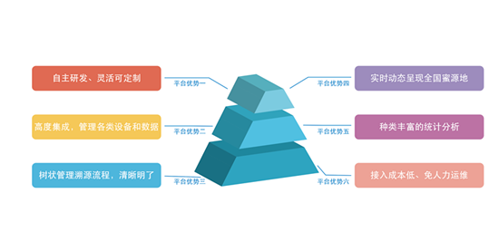 智慧蜂业平台以蜂产业为研究对象,综合应用物联网、视频巡航、3S技术、无人机、无线通讯、深度学习等信息技术手段开展基于物联网的蜂场环境信息采集与监测、蜜源地调查、智能蜂箱关键设备、智能式蜂王浆测报仪、蜂产品质量安全控制及全产业链大数据分析技术研究,通过智能感知、互联互通和自动分析,打造集智慧蜂场建设、智能装备研制、质量安全监控、蜂产业大数据决策和知识服务于一体的智慧蜂业管理平台,提高蜂场管理效率和质量,节省人工成本,增强品牌效应,提升经营收益,着力构建标准化、信息化、智能化的蜂业信息服务模式。