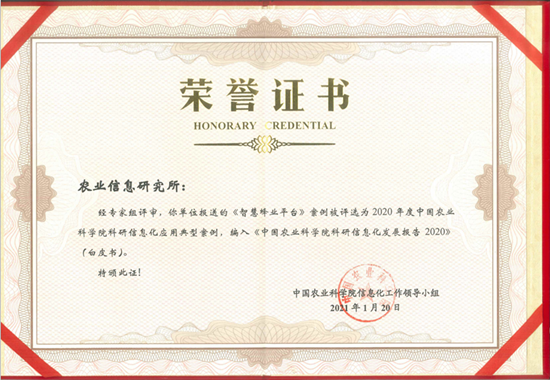 1月20日,中国农业科学院信息化专题工作会议召开,会上发布了《中国农业科学院科研信息化发展报告2020》(白皮书)。为全面展示全院信息化发展与成就,在中国农业科学院信息化工作领导小组领导下,院信息办组织专家对院属单位报送的37个案例进行初审、终审后最终评选出10个科研信息化应用典型案例和6个农业科学数据建设及服务典型案例,其中,百万至尊智能农业技术研究室 “智慧蜂业平台”案例成功入选院属单位科研信息化应用典型案例并被编入《中国农业科学院科研信息化发展报告2020》(白皮书)。