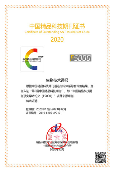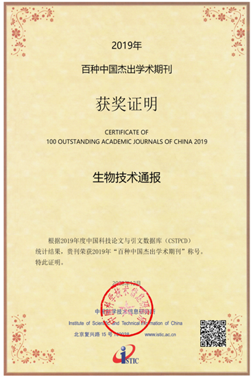 2020年12月29日,中国科学技术信息研究所(简称中信所)发布了2020年中国科技论文统计结果, 《生物技术通报》首次入选2019年度“中国百种杰出学术期刊”暨“中国精品科技期刊”;连续6年入选“中国科技核心期刊”。