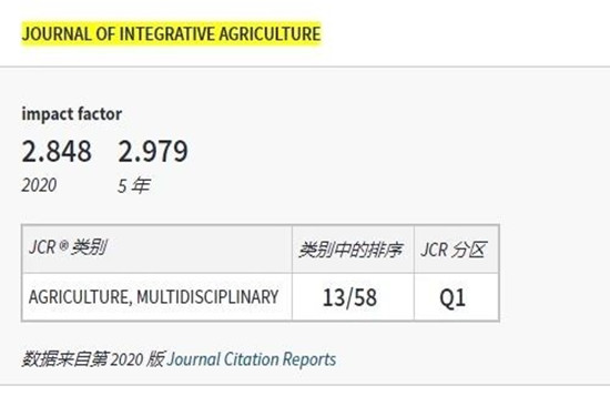 2021年6月30日,科睿唯安发布2021年度《期刊引证报告》(JCR)。Journal of Integrative Agriculture (JIA,《农业科学学报》)最新影响因子2.848(同比增幅44%),位居SCI-JCR农业综合学科13/58,保持Q1区;总被引频次5788次(同比增幅61%)。