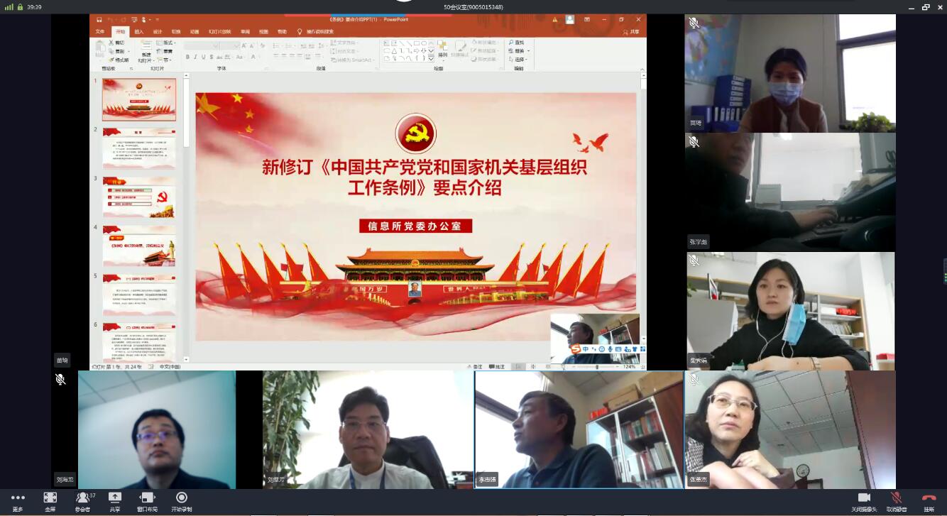 4月2日,信息所召开理论学习中心组(扩大)视频会,专题学习《中国共产党党和国家机关基层组织工作条例》。所党政班子成员,党委委员,事业部主任,各部门负责人、PI,党支部书记参会,会议由党委书记刘继芳主持。