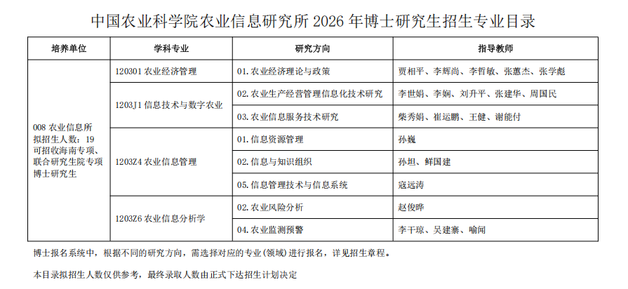 3. 关于报考条件、报名程序等问题可咨询中国农业科学院研究生院招生办公室(010-82106766,62162692),关于导师信息、考核录取等问题可咨询信息所科研处(010-82109907;xxszs@caas.cn);